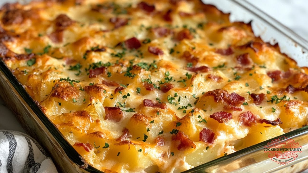 All the flavors of a fully loaded baked potato — sharp cheddar, sour cream, crispy bacon, and chives — layered into a bubbling casserole that feeds a crowd without babysitting ten individual potatoes. We broke down the most-watched YouTube versions to build one technique that gets the texture right every time.